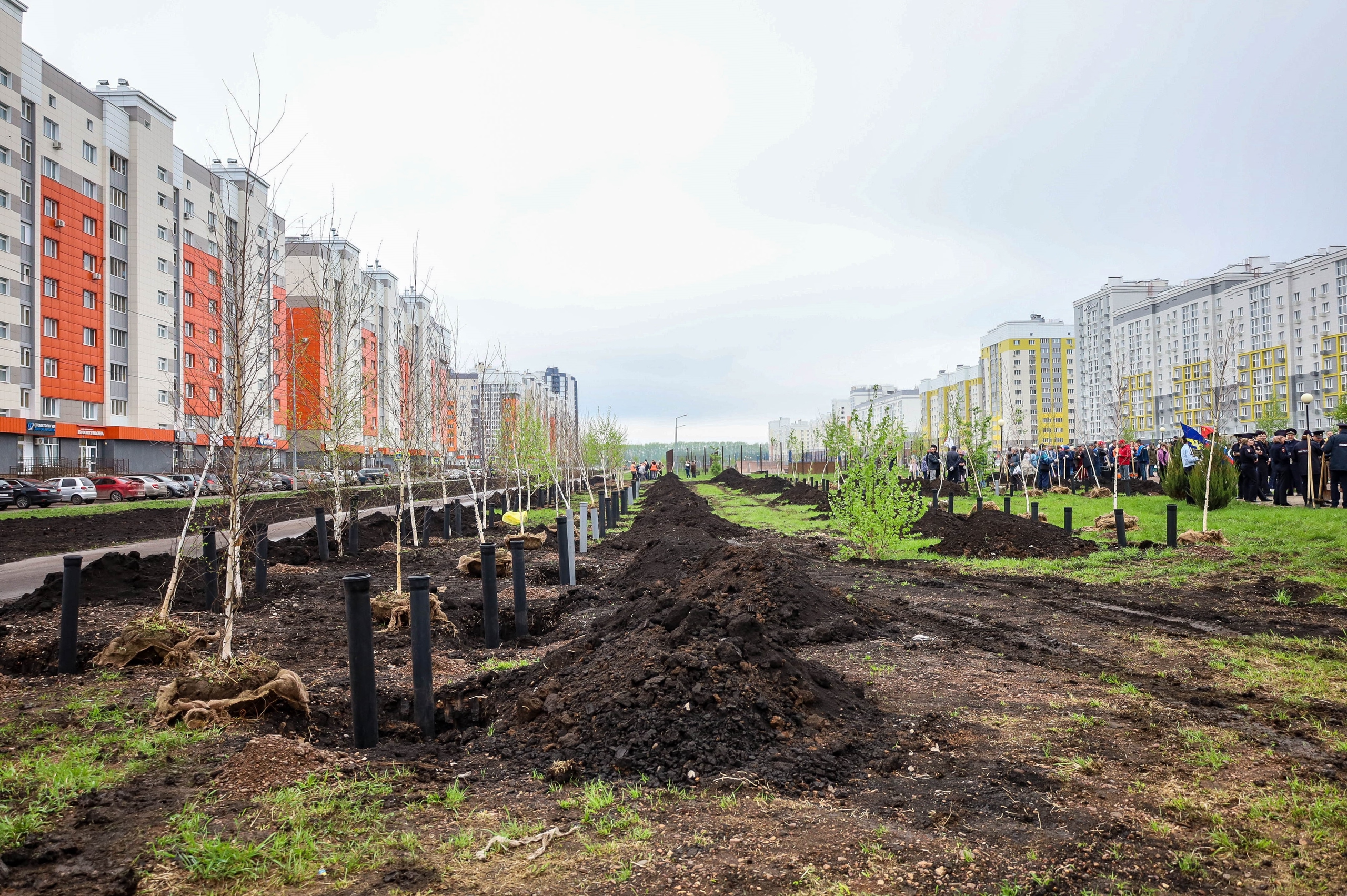 Сегодня высадили несколько деревьев напротив дома № 91 по проспекту Октября. Теперь небольшой участок местного бульвара станет памятным местом в честь 80-летия Великой Победы. Саженцев берёзы было всего 80, а людей пришло около 300 (если не больше) — так что каждое дерево сажали целой дружной компанией!