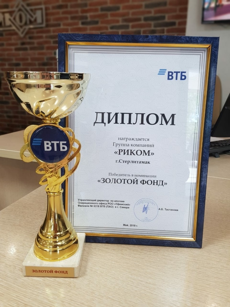 28 мая в торжественной обстановке ресторана «Куганак» банк «ВТБ» провели бизнес-завтрак с партнерами в Стерлитамаке. Итогами встречи стал диплом и кубок победителя в номинации «Золотой фонд», который достался ГК «Риком». Номинация является признанием того, что в Стерлитамаке новостройки от ГК «Риком» составляют золотой фонд квартир.